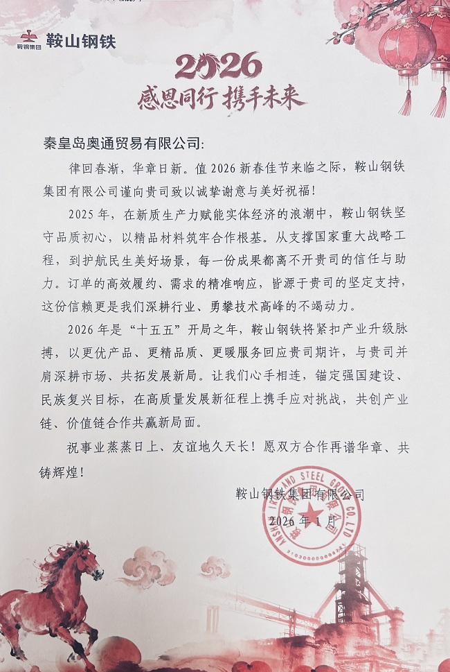近日,我司秦皇岛奥通贸易有限公司收到来自鞍山钢铁集团有限公司的2026年新春贺函。这份来自国内钢铁行业领军企业的诚挚祝福,既是对过去一年合作成果的高度认可,也是对双方未来共赢发展的深切期许。